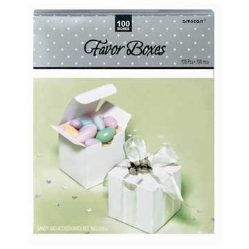 Create beautiful favors with our white favor boxes. Each package includes 100 white boxes measuring 2 1/4"L x 2 1/4"W. Add ribbon and favor charms for a custom look. Candy not included.